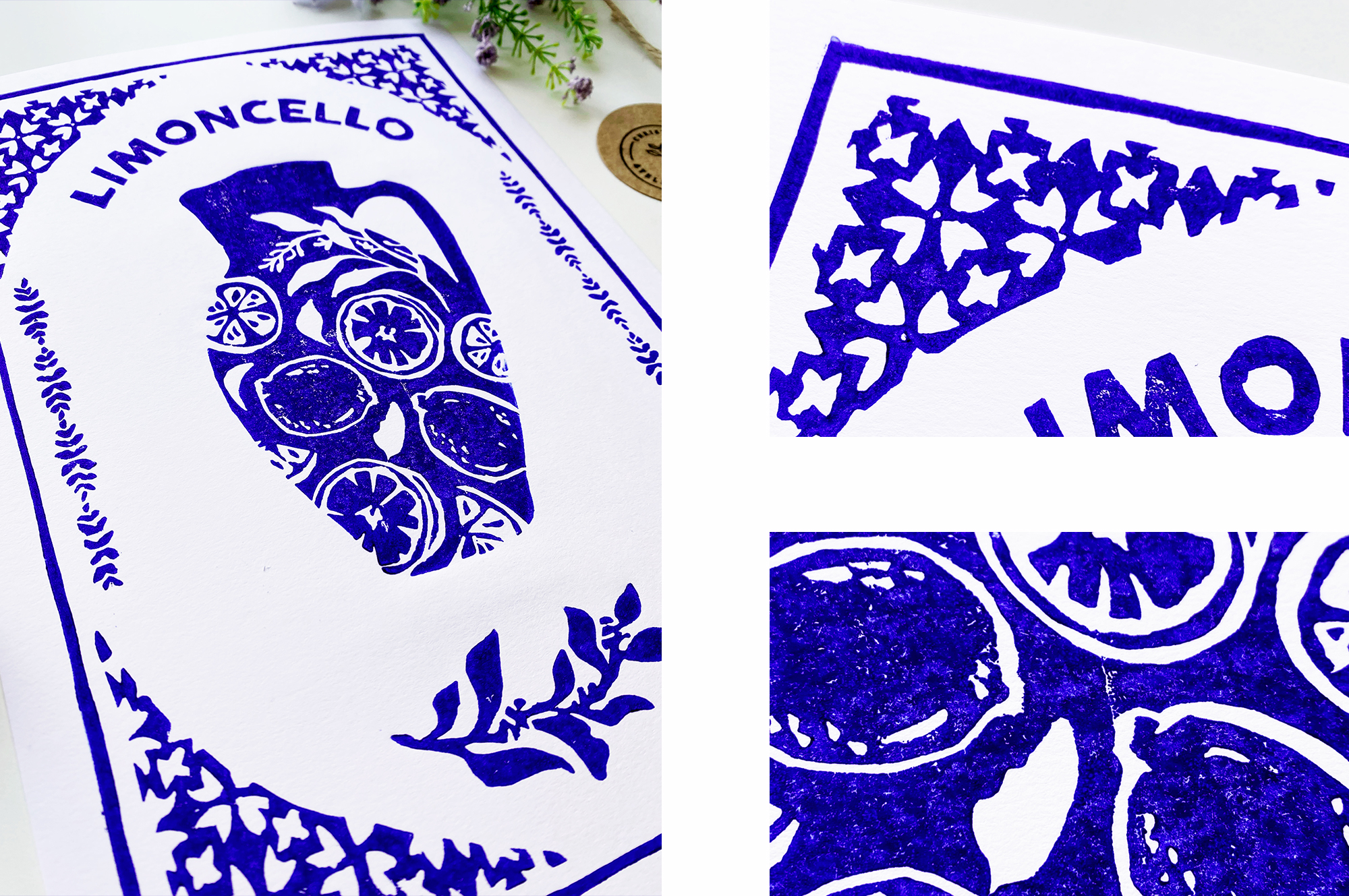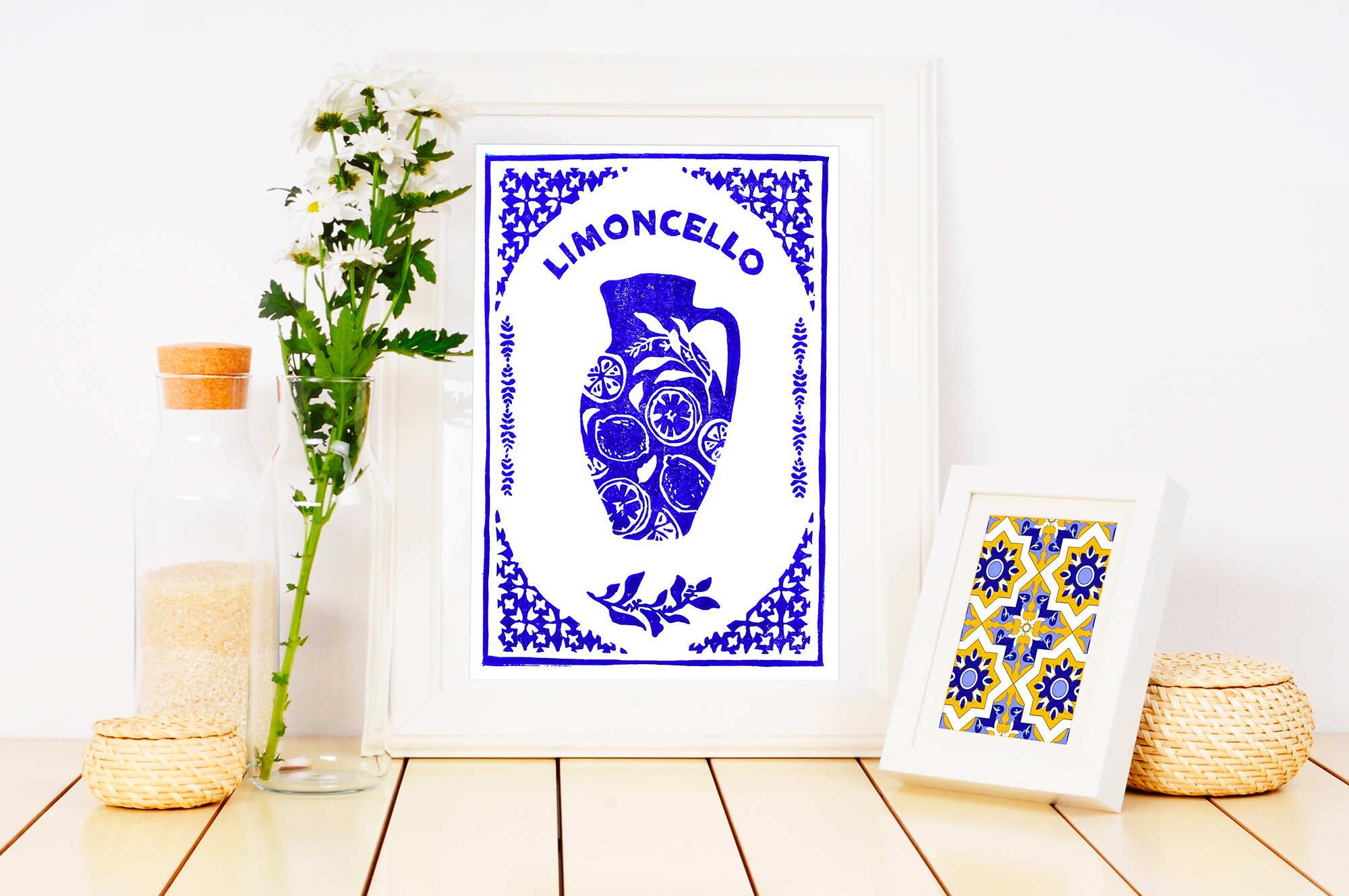 Cette affiche est une impression originale réalisée par mes soins en linogravure. Le limoncello est une liqueur de citron typique d'Italie, elle donnera un air d'été et de Méditerranée à votre décoration.