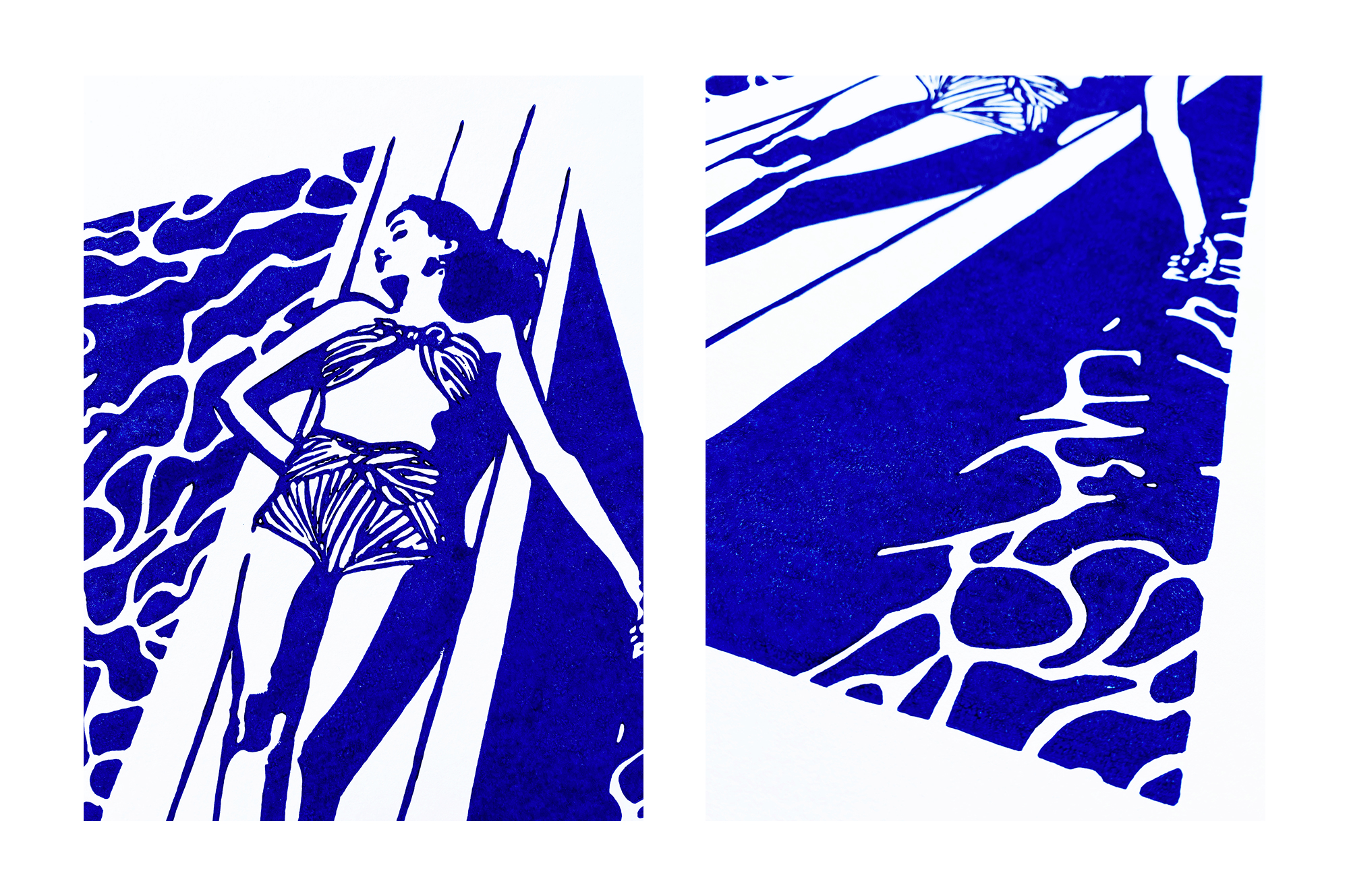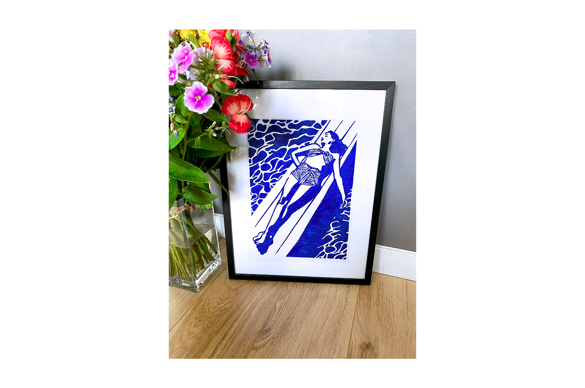 Cette affiche est une impression originale réalisée par mes soins en linogravure. Elle illustre une femme détendue sur son surf. Cette affiche aux inspirations vintage donnera une touche retro à votre décoration.