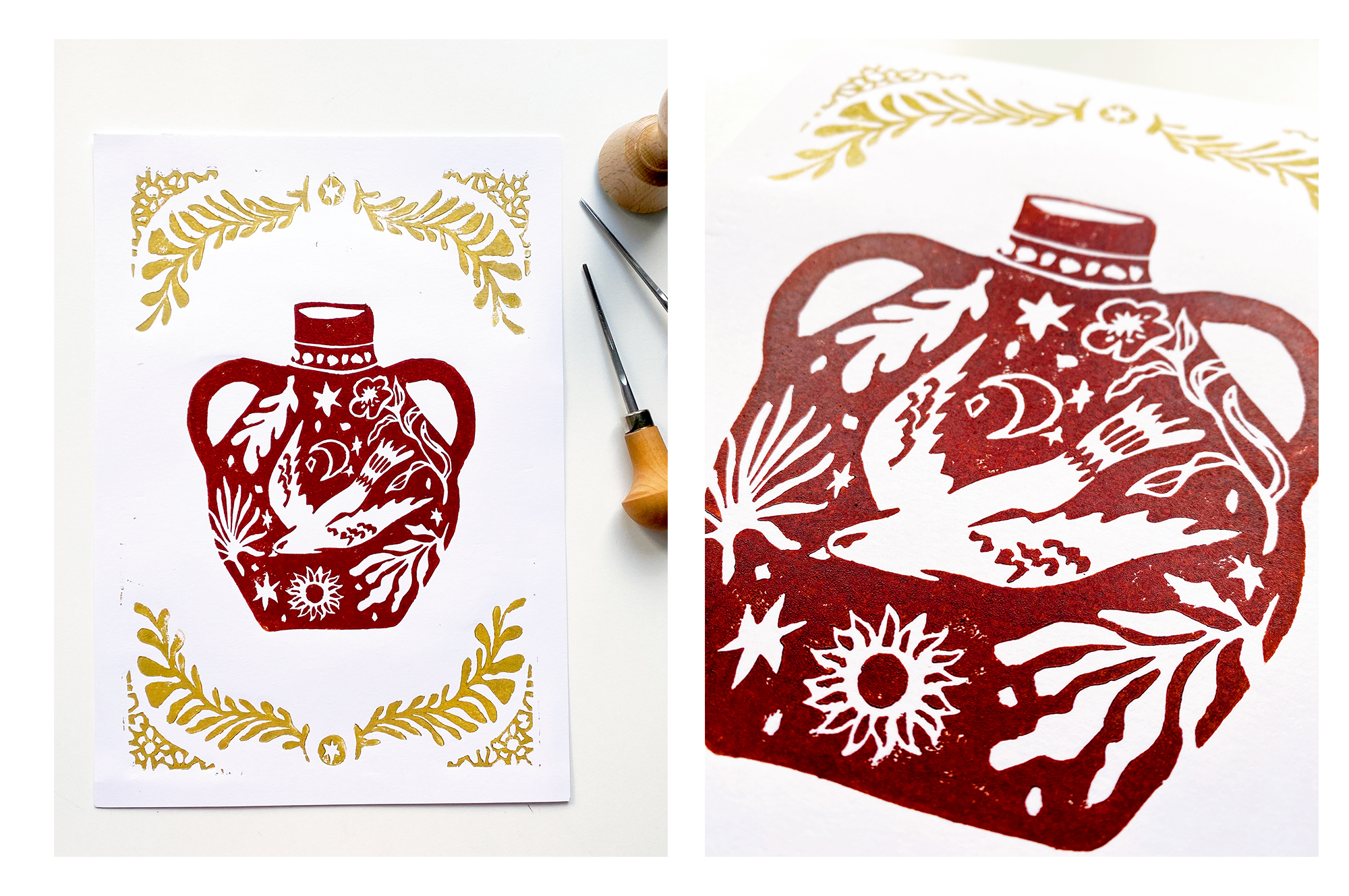 Cette affiche est une impression originale réalisée par mes soins en linogravure. Elle représente une vase antique en version poétique.